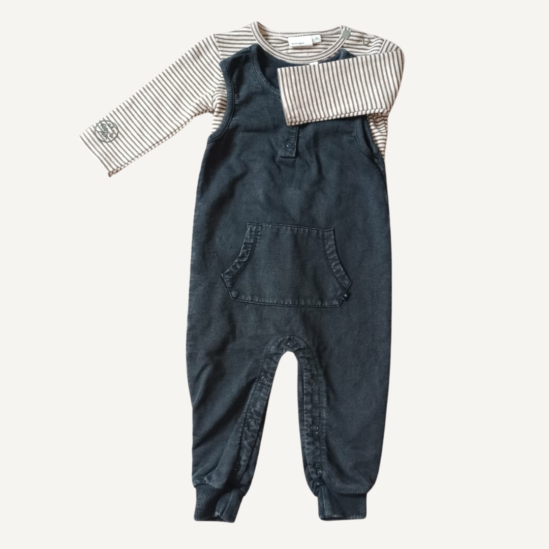 Combinaison effet denim avec une poche centrale et une fermeture boutonnée en bas pour plus de confort. Le t-shirt rayé à manches longues dans des tons neutres ajoute une touche classique et intemporelle. Un look moderne et polyvalent pour toutes les occasions ! 👶💙