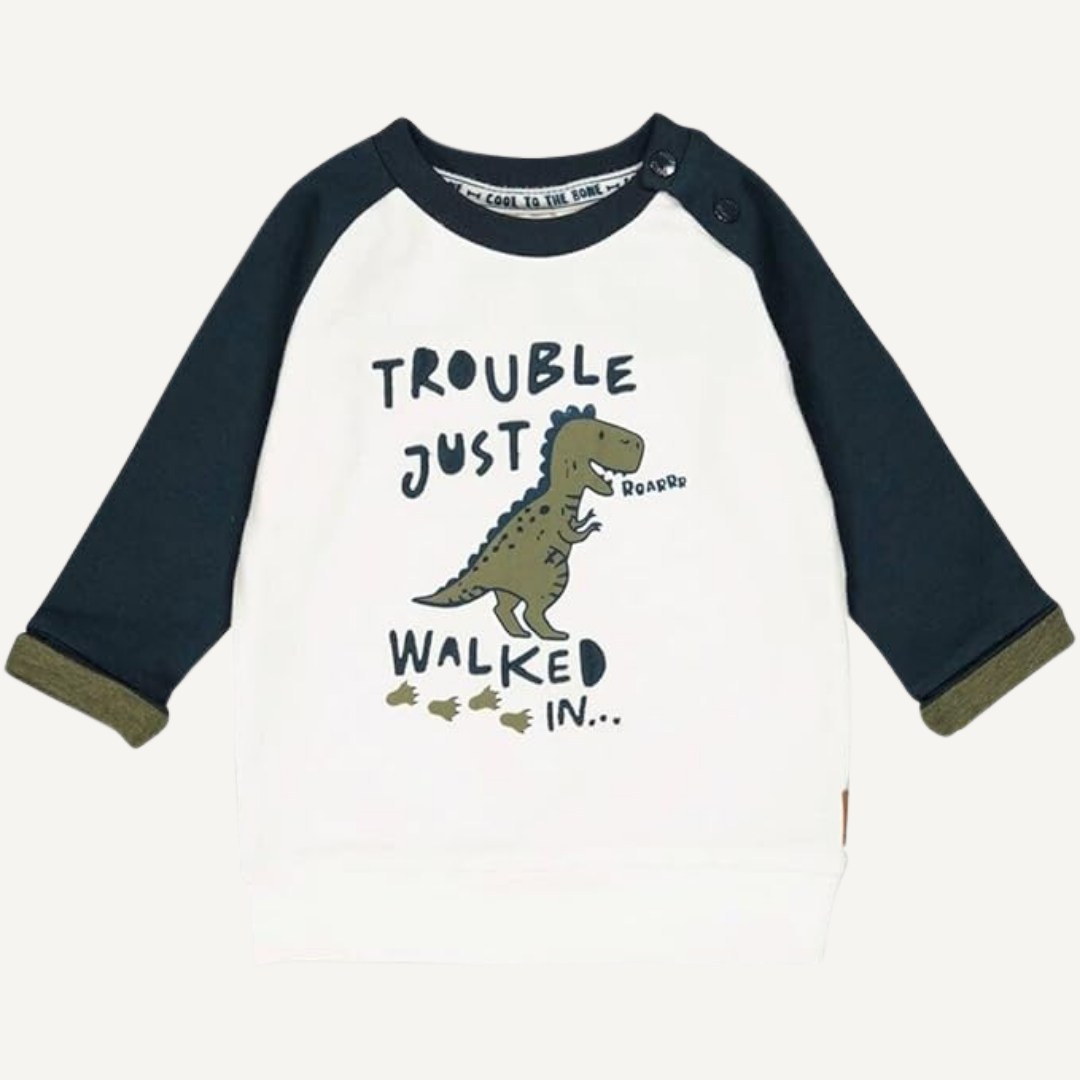Una camiseta divertida y cómoda que lo dice todo: "Trouble just walked in..." con un simpático dinosaurio estampado. Esta prenda de la marca Feetje está confeccionada en algodón suave, ideal para la piel delicada de los más pequeños. Las mangas raglán en azul marino y el diseño gráfico la convierten en una opción perfecta para dar estilo incluso a las travesuras más tiernas. Cierre a presión en el hombro para un cambio rápido y fácil.