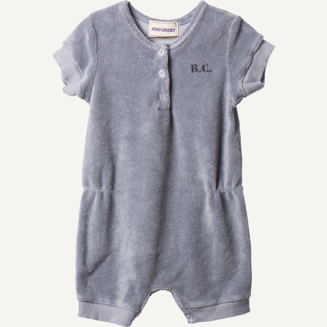 Este mono corto de rizo en color gris de Bobo Choses es una prenda cómoda y con estilo, perfecta para los días más cálidos.